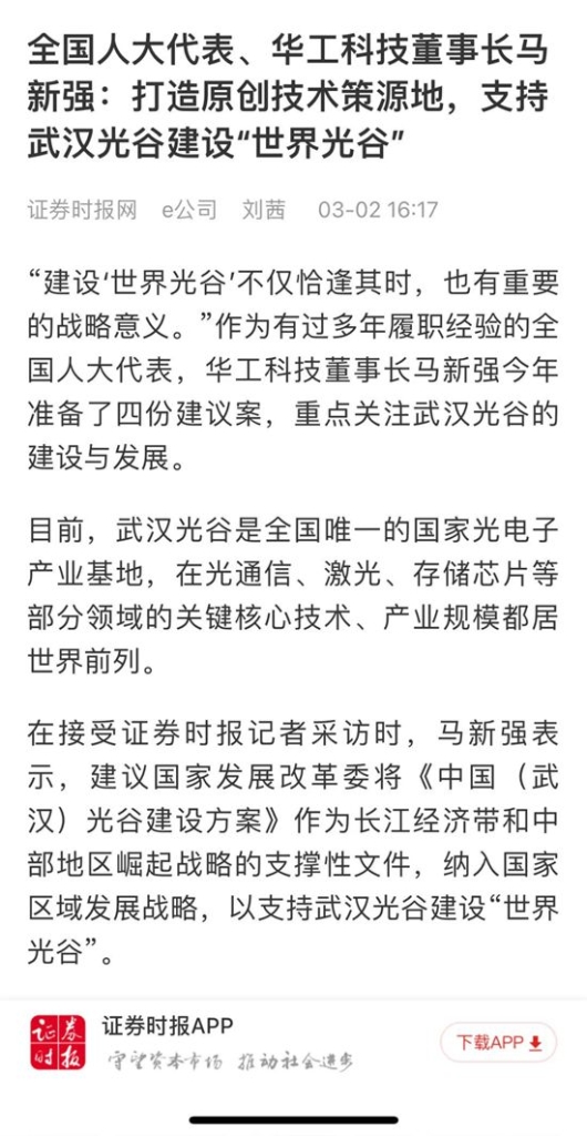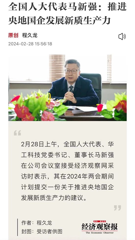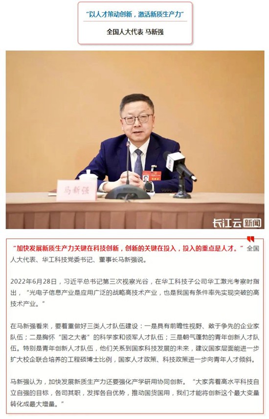 人民日報、新華社、中央電視臺、經濟日報、科技日報、新華網、工業和信息化部宣傳中心、人民郵電報、中國工業報、中國經濟網、證券時報、證券日報、上海證券報、21世紀經濟報、經濟觀察報、湖北日報、極目新聞、長江日報等多家媒體關注馬新強代表的履職情況及華工科技創新發展。